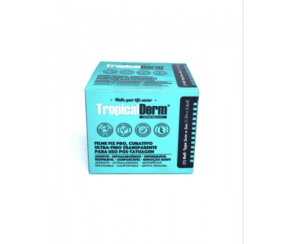 Rolo de 5cm x 5mtrs. O adesivo ultra-fino TropicalDerm® Filme Fix® PRO de tecnologia Japonesa, é a única solução certificada de pós-tratamento para tatuagem na fase inicial de cicatrização de uma tatuagem. Se encaixa a pele se tornando transparente e se estende com máis facilidade, fornecendo flexibilidade e liberdade nos movimentos reduz o risco de infecções devido à penetração de corpos estranhos e oferece à pele a oportunidade de se regenerar em um ambiente úmido. Isso permite que a pele relaxe da melhor maneira possível e inclua a tatuagem na pele.